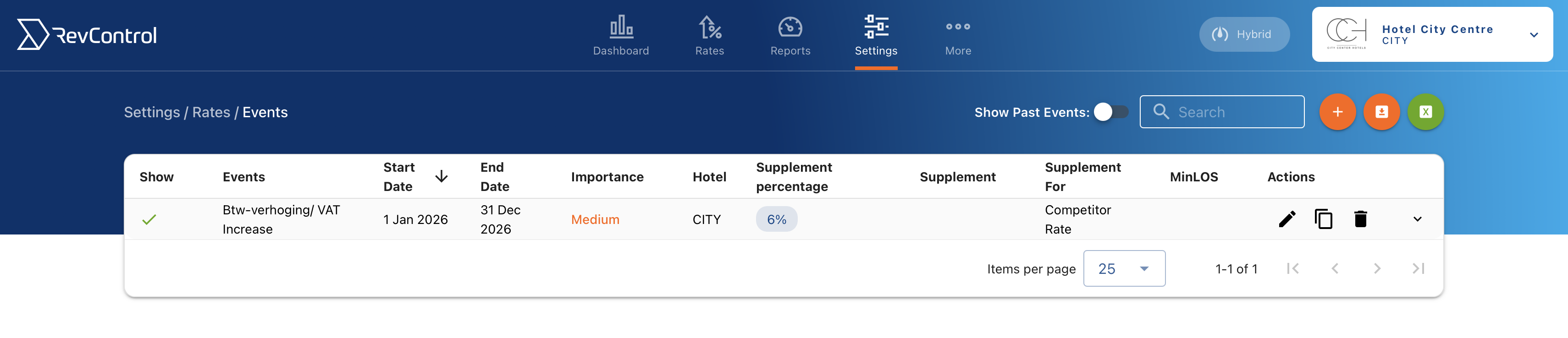 - Are competitors still at the same level? Then create an event for the period from 1 January through 31 December 2026 with a percentage increase and select Supplement for the Competitor Based Rate. Note: The event period can be adjusted at your discretion once there is more clarity about the effective date. In any case, monitor daily how competitors are adjusting their prices for 2026 and lower the percentage of your event as more competitors implement the increase. Once the market has fully followed, you can remove the event.