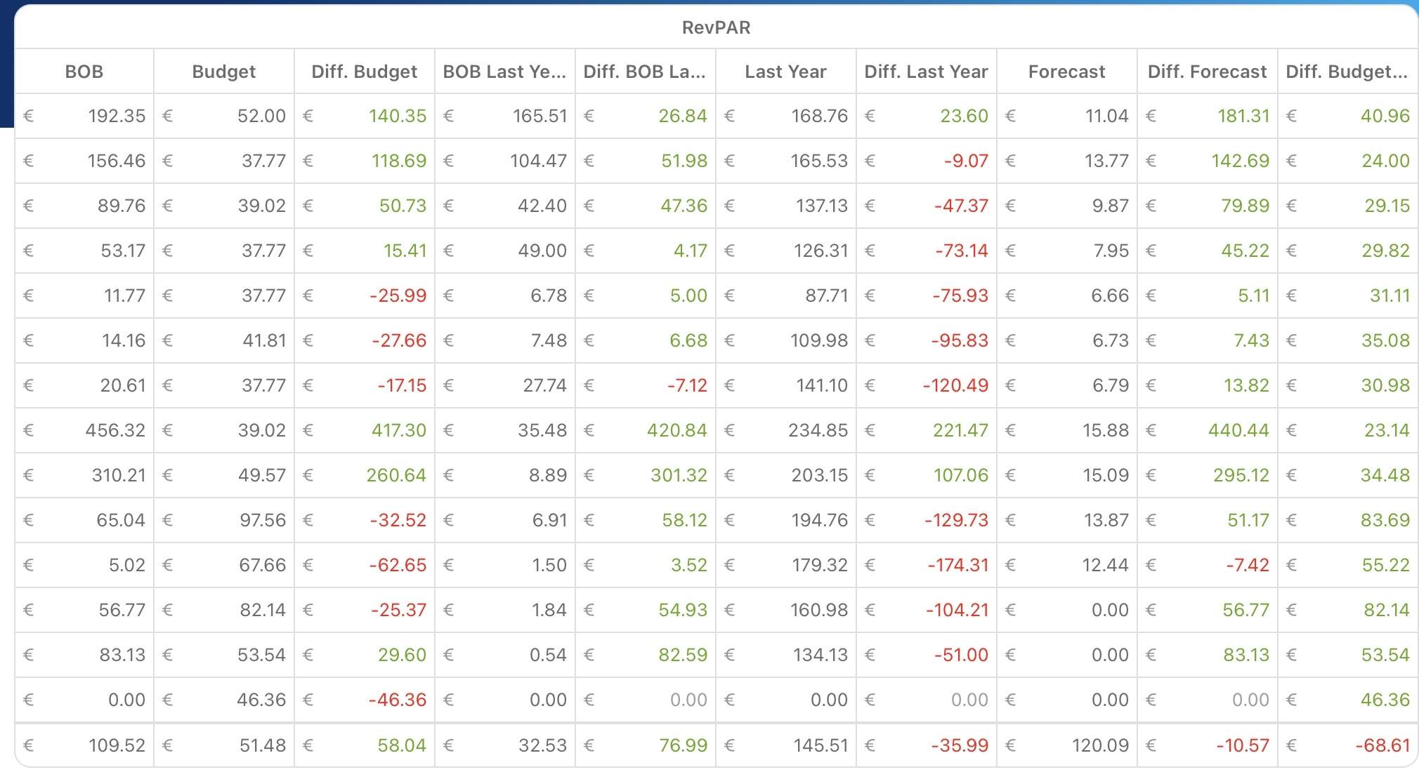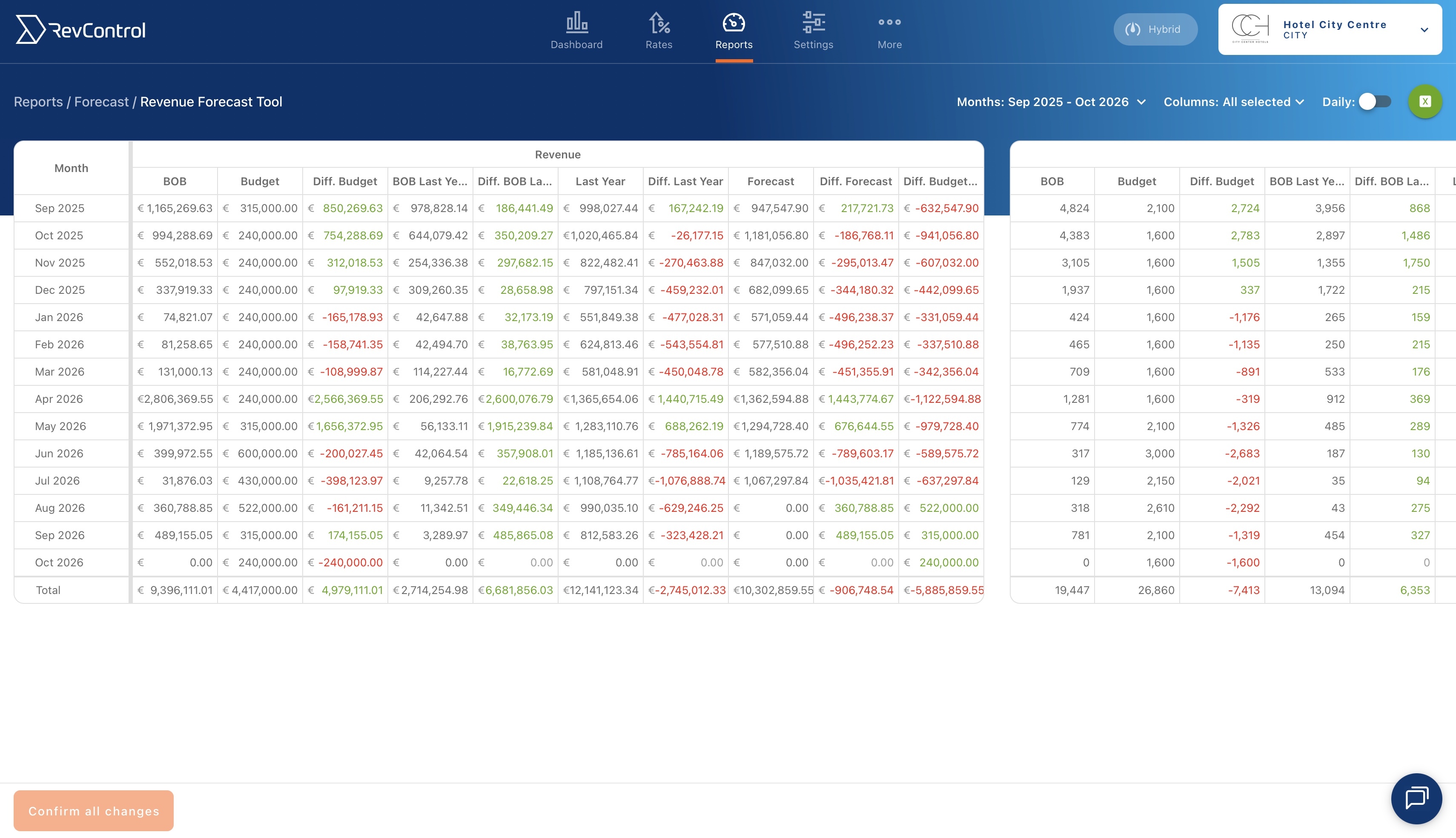 Das Revenue Forecast Tool wurde entwickelt, um Ihre Forecast-Einblicke übersichtlich und flexibel darzustellen. Sie können ganz einfach wichtige KPI’s vergleichen, wie Revenue, Room Nights, ADR und RevPAR. Mit der Funktion Columns bestimmen Sie selbst, welche Daten angezeigt werden, sodass der Report immer genau Ihren Bedürfnissen entspricht. Über den Schalter oben rechts wählen Sie, ob Sie die Ergebnisse pro Tag oder pro Monat anzeigen möchten. Selbstverständlich lässt sich der Report auch problemlos nach Excel exportieren, um die Daten weiterzugeben oder weiter zu verarbeiten.