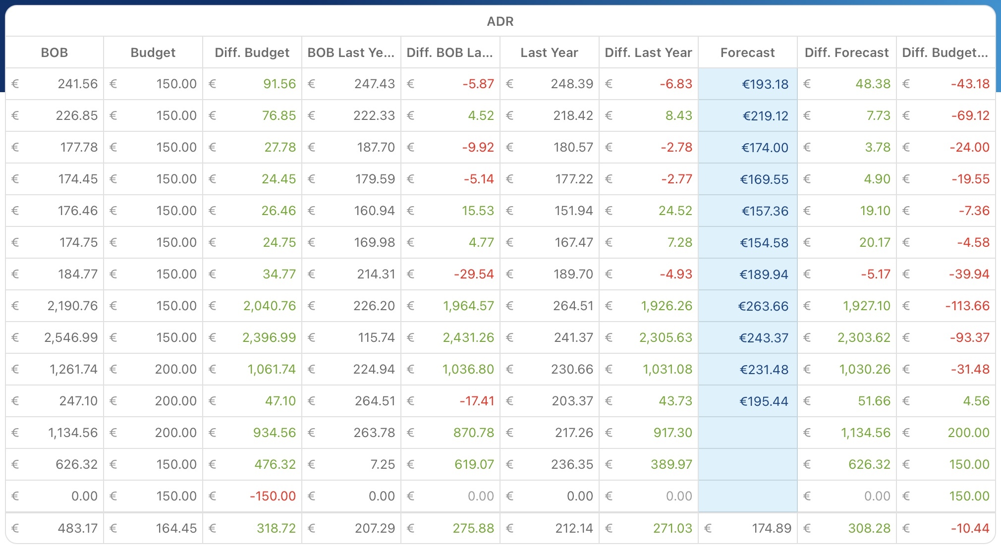 Besonders praktisch am Revenue Forecast Tool ist, dass Sie auch Ihre eigene Umsatzprognose berechnen können. Geben Sie einfach den erwarteten ADR ein und passen Sie (falls gewünscht) die berechnete Forecast an. RevControl berechnet dann automatisch den prognostizierten Umsatz. So erhalten Sie noch mehr Kontrolle über Ihre zukünftigen Ergebnisse und können verschiedene Szenarien einfach durchspielen.
